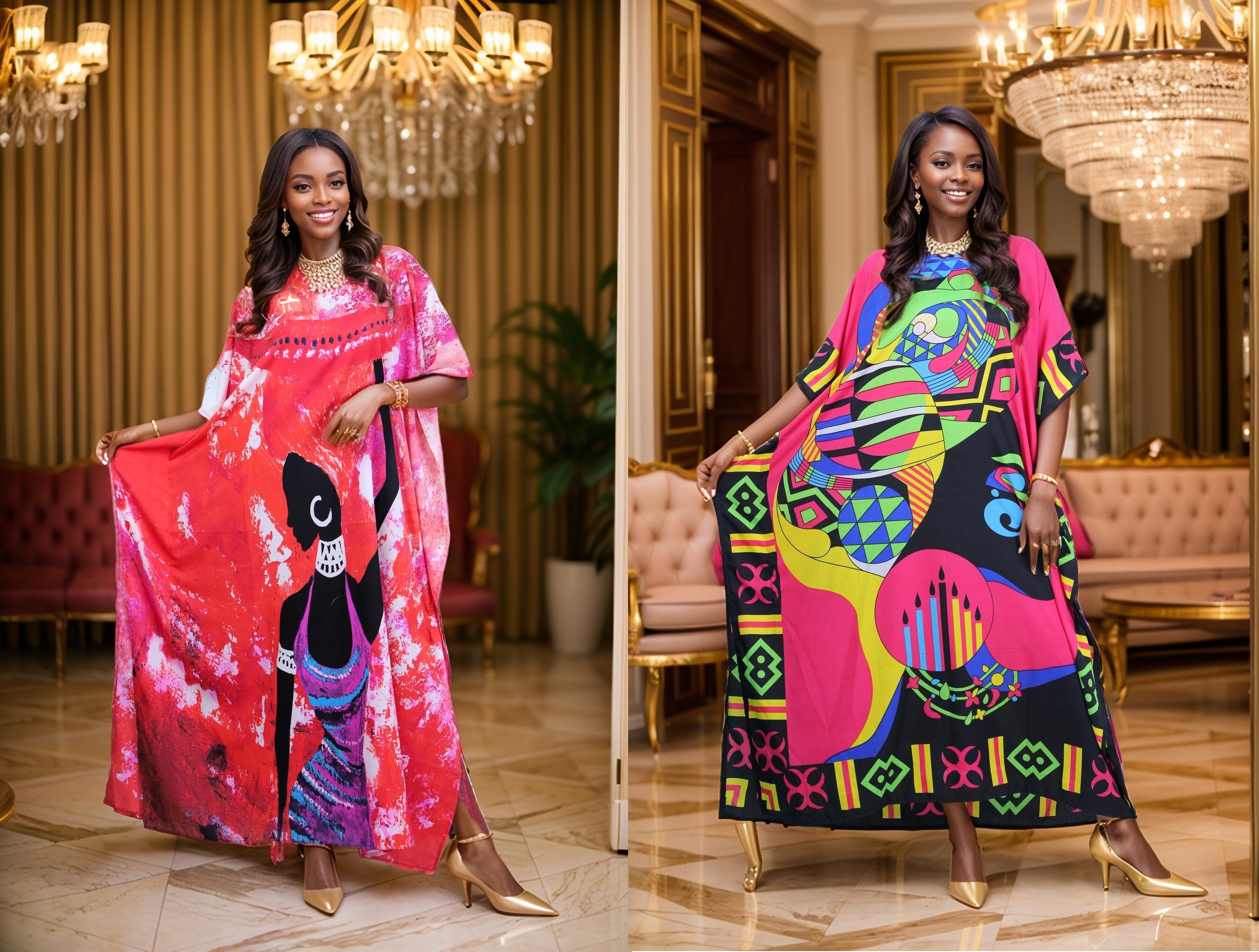 Women's Plus Size African Multi-Print Kaftan Dress - Green/Red