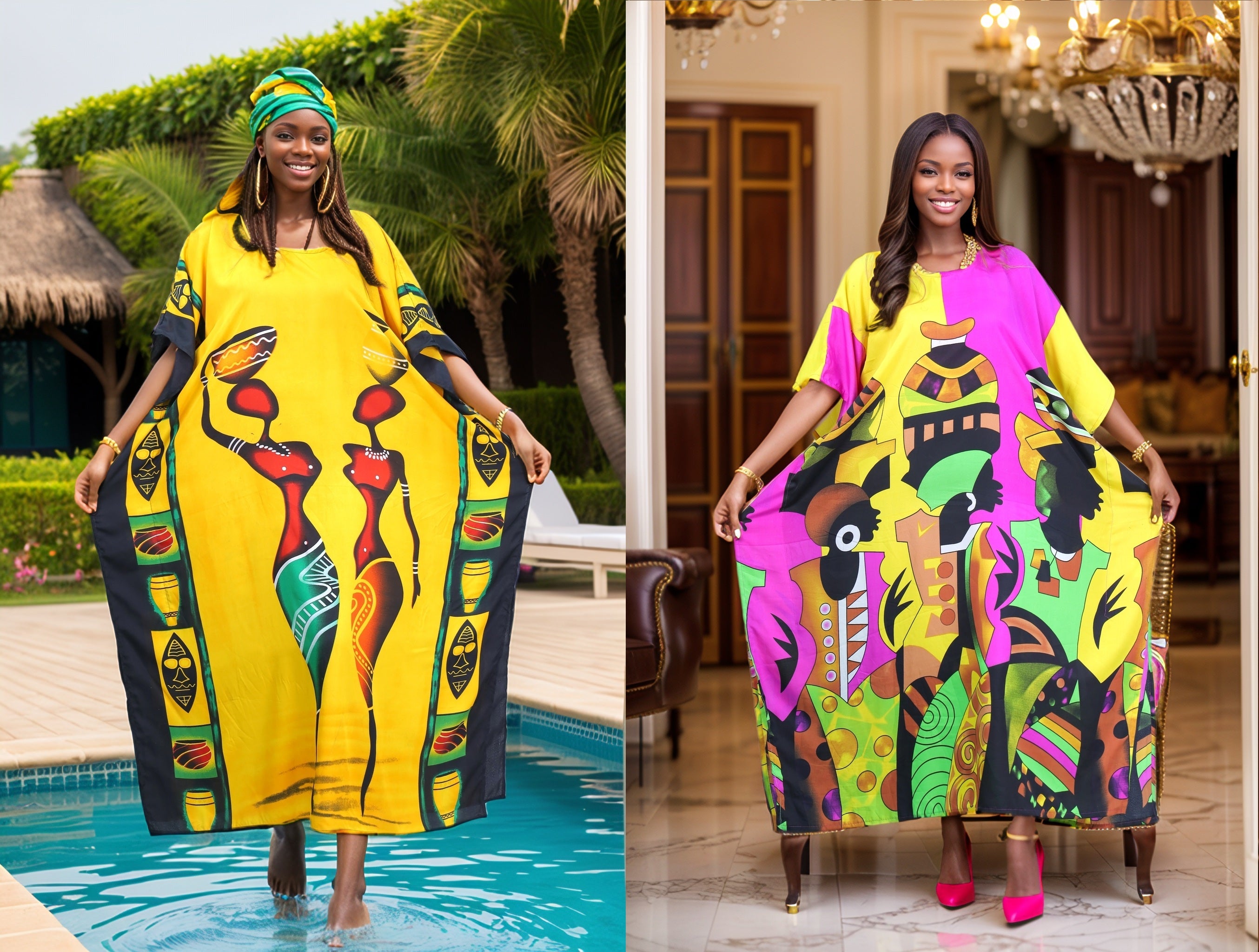 Women's Plus Size African Multi-Print Kaftan Dress - Yellow/Pink